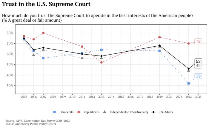 From 2005-2019, large majorities of Americans across the political spectrum either had a “great deal” or a “fair amount” of trust in the Supreme Court, according to APPC surveys. From 2019 to 2022, however, confidence in the Supreme Court plunged 22 percentage points, from 68% to 46%, a finding mirrored in data from other survey firms, including Gallup and Pew.