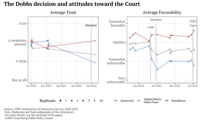 “We have data from the Annenberg Public Policy Center’s Constitution Day surveys going back to 2006,” Levendusky said, “and on occasion we see trust and approval bounce around a bit between Democrats and Republicans. But starting in 2022, we see very clear views of partisan polarization of the court so that post-Dobbs, those who support abortion access or are Democrats think much less of the court, while people who are Republican or disapprove of abortion think highly of the court.”