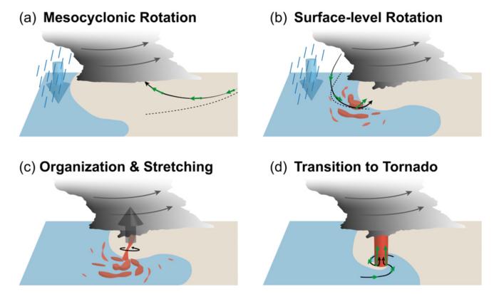 Reconceptualizing tornado formation. This article helps to further unravel the enduring meteorological mystery of how supercell storms generate tornadoes, thanks to new research techniques that allow us to observe and model small-scale processes. Blending prior research with recent insights, the authors propose a four-step conceptual model, with the following key processes: a) the initial creation of a rotating updraft, b) development of disorganized patches of rotation at the land surface, c) the organization of these patches into a more defined, symmetric vortex, and d) the final transition into a fully developed tornado, a newly understood phase in which air turns abruptly upward very near the surface, enabling the tornado vortex to more easily persist.
