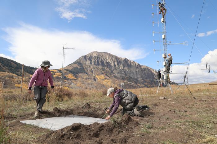 Sublimation of Snow Project principal investigator Jessica Lundquist (University of Washington) and co-principal investigator Julie Vano (AGCI) install a snow pillow, while members of the National Center for Atmospheric Research team install instrumentation on a 20 meter/70 ft tower at the Rocky Mountain Biological Laboratory in Gothic, Colorado. Photo: Emilio Mateo/Aspen Global Change Institute. Read about this project: https://doi.org/10.1175/BAMS-D-23-0191.1
