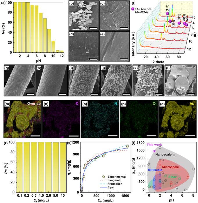 Au recovery performance of the ALPF. (a) Effect of pH in Au solution on the Au recovery performance of the ALPF. Ci, t, and adsorbent doses were 100 mg/L, 24 h, and 0.5 g/L, respectively. FESEM images of the ALPF surface after Au recovery at pH of (b) 3, (c) 6, (d) 9, and (e) 12, showing the Au(0) particles on the ALPF surface. Scale bar is 1 μm. (f) XRD patterns of the ALPF after Au recovery in the pH range of 2-12. (g-l) FESEM images of the ALPF after Au recovery at Ci of (g) 0.1, (h) 1, (i) 10, (j) 100, (k) 500, and (l) 1000 mg/L for 24 h with stirring at 200 rpm. pH was adjusted to 1. Scale bar is 20 μm. (m-q) FESEM-EDS mapping of the chemical elements distributions for the ALPF after Au recovery at Ci of 1000 mg/L: (m) overlap, (n) carbon, (o) nitrogen, (p) oxygen, and (q) gold. Scale bar is 20 μm. (r) Recovery efficiencies of the ALPF for Au recovery in a low Ci range of 0.1-100 mg/L. (s) Adsorption isotherm test result of the ALPF adsorbent. The experimentally obtained data were fitted by three representative isotherm equations of Langmuir, Freundlich, and Sips models. (t) Comparison of qm and optimum pH value for the ALPF adsorbent with those of the adsorbents best reported in the literature, classified by the adsorbent size (nano, micro, and milliscale) or shape (particle and fiber)