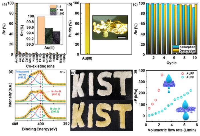 KIST researchers have chemically immobilized alkaline molecules on the surface of polyacrylonitrile (PANF) fibers to improve both molecular gold recovery performance and structural stability. The amine-containing polymer fiber has a dramatically larger surface area, which can improve the adsorption performance of gold ions (Au) in waste by up to 2.5 times (from 576 mg/g to 1,462 mg/g) compared to the team's previously developed granular gold adsorption material.