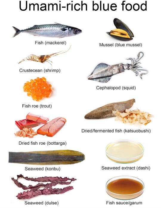 The list of seafoods with large concentrations of umami is long. It includes everything from fish like cod and mackerel, to shellfish and molluscs like shrimp and octopus, to the roe of alaska pollock and blue mussel, to various types of seaweed and on to processed seafood products like anchovy paste and fish sauce.