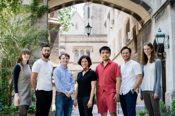 PART OF AN INTERDISCIPLINARY UNIVERSITY OF CHICAGO TEAM BEHIND A NEW METHOD OF USING STATIC DATA FROM SINGLE-CELL RNA SEQUENCING TO STUDY HOW CELLS AND GENES CHANGE OVER TIME. FROM LEFT, BIOPHYSICS GRADUATE STUDENT HANNA HIEROMNIMON, PRITZKER SCHOOL OF MOLECULAR ENGINEERING GRADUATE STUDENT JOEY FEDERICO, COMPUTER SCIENCE GRADUATE STUDENT RYAN ROBINETT, PME ASST. PROF. SAMANTHA RIESENFELD, CHEMISTRY GRADUATE STUDENT AND PAPER FIRST AUTHOR CHENG FRANK GAO, CHEMISTRY GRADUATE STUDENT JOSEPH SIFAKIS AND BIOPHYSICS GRADUATE STUDENT HOPE ANDERSON.