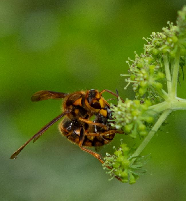 A JAPANESE GIANT HORNET VESPA MANDARINIA VISITING THE INFLORESCENCE OF ANGELICA DECURSIVA TO FEED ON NECTAR