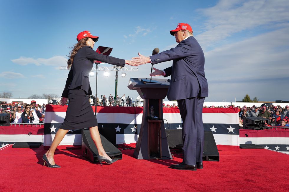 Republican presidential candidate former President Donald Trump greets South Dakota Gov. Kristi Noem during a rally at the Dayton International Airport on March 16, 2024, in Vandalia, Ohio. The rally was hosted by the Buckeye Values PAC.