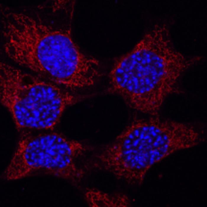 Mouse neuronal cells with mitochondria (red) and nuclei (blue).