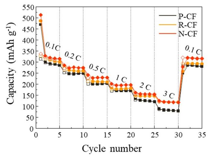 (P-CF: raw material, R-CF: recycled carbon fiber, N-CF: nitrogen-doped recycled carbon fiber)