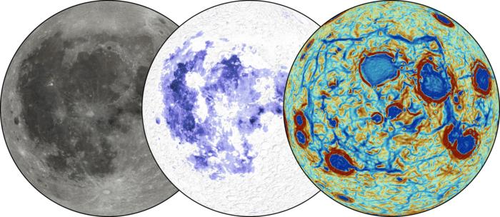 Three views of the moon's nearside: the familiar sight from Earth (left), regions covered by titanium-rich volcanic flows (center) and polygonal pattern of gravity anomalies