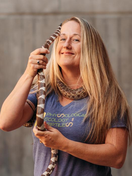 A CALIFORNIA KINGSNAKE IN HER HANDS, WHILE TOTING A GOPHER SNAKE AROUND HER NECK.
