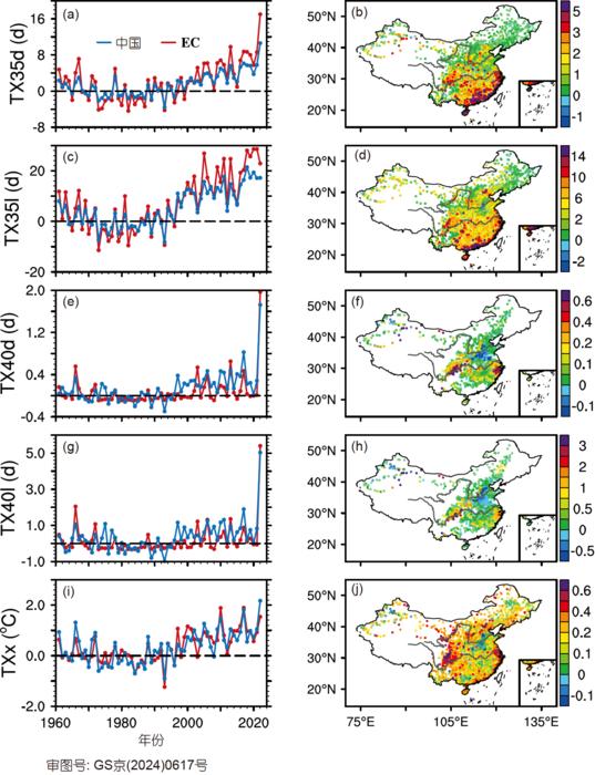 THIS FIGURE ILLUSTRATES THE CHANGES IN TX40D (NUMBER OF DAYS WITH TEMPERATURES EXCEEDING 40°C), TX40L (LENGTH OF THE SEASON WITH TEMPERATURES EXCEEDING 40°C), AND TXX (INTENSITY OF HIGH TEMPERATURES) OVER CHINA. IT DEMONSTRATES THAT TX40D IS INCREASING, TX40L IS EXTENDING, AND TXX IS STRENGTHENING, ESPECIALLY IN 2022, THE INCREASE OF THESE INDICATORS HAS BROKEN THROUGH HISTORICAL EXTREMES.