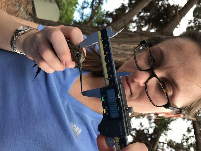 Dr. Jessie Williamson measures a Southern Giant Hummingbird in Chile.