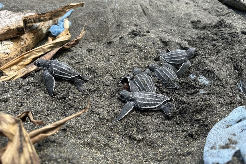 Turtle hatchlings face a dangerous journey to the water after reaching the surface of their nest.(ABC News: Chrisnrita Aumanu-Leong)