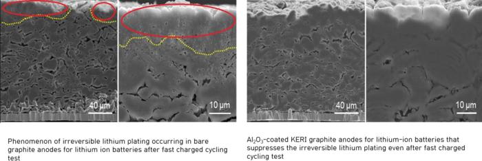 Phenomenon of irreversible lithium plating occurring in lithium-ion batteries with conventional anodes after fast charged cycling test, (right) Al2O3-coated KERI anode for lithium-ion batteries that suppresses the irreversible lithium plating even after fast charged cycling test.