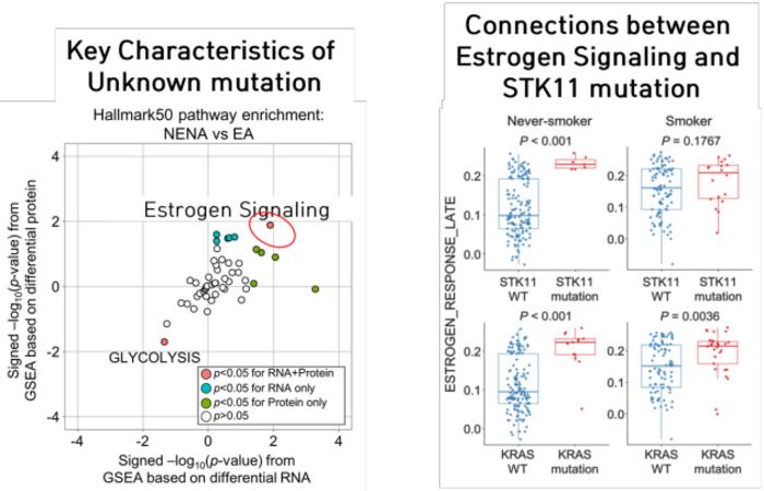 (Right) Patients with driver mutations in STK11 and ERBB2 show significant differences in smoking history, and high estrogen response shows similar results to known KRAS mutations.