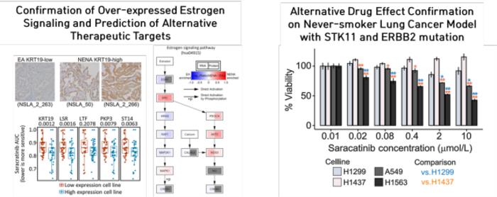 Analysis of genetic mutations and cellular signaling pathways revealed that driver mutations of genes known to be associated with cancer, such as STK11 and ERBB2, were observed in the tissues of never-smoking lung cancer patients. Additionally, while the estrogen signaling pathway was found to be overexpressed, there were no significant changes in estrogen hormone receptors. Based on this, saracatinib, a sub estrogen signaling transduction protein inhibitor, showed statistically significant (p<0.01) cell death effects when applied to cells with mutations in STK11 and ERBB2 compared to the control group without such mutations.