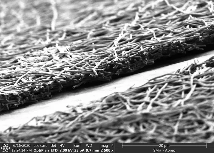 SCANNING ELECTRON MICROGRAPHS SHOW THE DETAILED FIBERS OF THE SF MEMBRANES