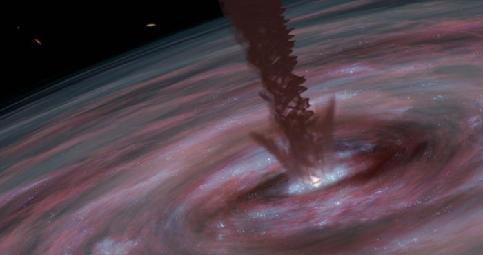 The researchers liken the matter traveling around a black hole to water circling a drain. As matter approaches the black hole, it first collects in a chaotic, spinning disk. There, magnetic fields develop and grow stronger. The magnetic fields help lift matter away from the galaxy, creating a vortex of wind. As matter is lost to the wind, the spinning disk slows, which turns the slow trickle of matter into a stream — meaning that matter flows more easily into the black hole.