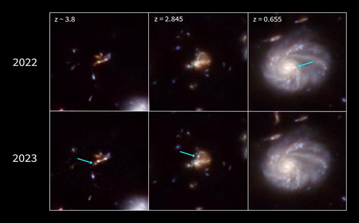 This mosaic displays three of about 80 transients, or objects of changing brightness, identified in data from the JADES (JWST Advanced Deep Extragalactic Survey) program. Most of the transients are the result of exploding stars or supernovae. By comparing images taken in 2022 and 2023, astronomers could locate supernovae that recently exploded (like the examples shown in the first two columns), or supernovae that had already exploded and whose light was fading away (third column). The age of each supernova can be determined from its redshift (designated by ‘z’). The light of the most distant supernova, at a redshift of 3.8, originated when the universe was only 1.7 billion years old. A redshift of 2.845 corresponds to a time 2.3 billion years after the big bang. The closest example, at a redshift of 0.655, shows light that left its galaxy about 6 billion years ago, when the universe was just over half its current age.