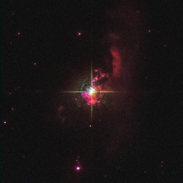A Hubble Space Telescope image of the symbiotic star Mira HM Sge. Located 3,400 light-years away in the constellation Sagitta, it consists of a red giant and a white dwarf companion. The stars are too close together to be resolved by Hubble. Material bleeds off the red giant and falls onto the dwarf, making it extremely bright. This system first flared up as a nova in 1975. The red nebulosity is evidence of the stellar wind. The nebula is about one-quarter light-year across.