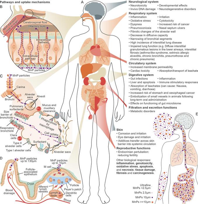 - Figure 2. Hypothesized uptake mechanisms of MnPs through human body (A–D) (A) Hypothesized uptake mechanisms of MnPs through human biological barriers, including via (B) the olfactory bulb, (C) the lung-air barrier, and (D) the gastrointestinal tract, indicating also the systems and organs directly affected by MnPs and the associated MnP impacts and suspected adverse health out comes including NCDs. The suspected particle-size fractionation caused by differences in the uptake mechanisms (A–D) is highlighted in (E), with larger particles being ingested (up to 130 mm) rather than inhaled (less than 2.5 mm) and only the smallest (nanoscale) particles being able to penetrate the blood-brain barrier. MnP internalized by routes (C) and (D) reach the wider circulatory system and from there can reach all organs.