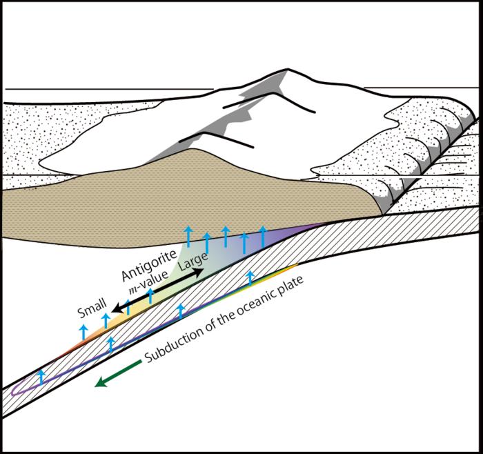 This suggests that the structure of antigorite in the oceanic lithosphere may gradually evolve into a polysome with a smaller m-value that differs from the antigorite observed under ambient pressure or near-surface pressure conditions (i.e. m=17) (Figure2). Such changes in m-values are accompanied by minor dehydration reactions. Changes in the amount of water in rocks and minerals due to the polysomatism of antigorite in subduction zones may affect the distribution of intermediate-depth earthquakes, such as those observed in the double seismic zone.