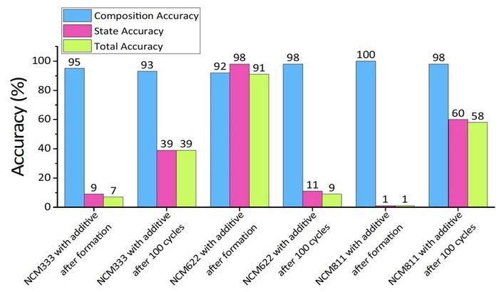 < Figure 2. Accuracies of CNN Model predictions on SEM images of NCM cathode materials with additives under various conditions. >