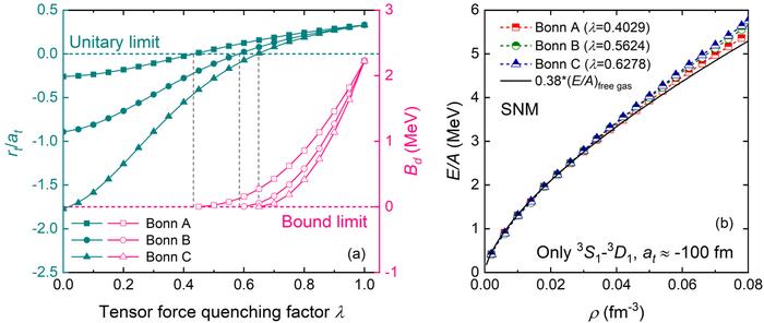 (a) The dimensionless ratio of the effective range rt to the scattering length at in spin triplet (left axis) and the binding energy for the deuteron Bd (right axis) with variation of the tensor force quenching factor λ . The upper (lower) horizontal dashed line denotes the locale of the unitary (bound) limit. (b) The ground-state energy per particle for SNM calculated with Bonn A, B, and C, where the scattering length at in spin-triplet channel is tuned to −100 fm. Only contributions from the 3S1-3D1 channel are considered. The results of a free Fermi gas with a scaling factor 0.38 is also displayed for comparison.