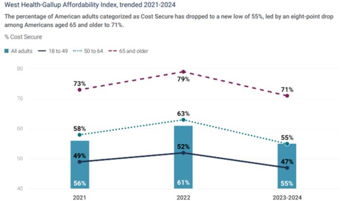 WASHINGTON, D.C. — July 17, 2024 — The percentage of Americans who can afford and access prescription drugs and quality healthcare stands at a new low of 55%, a six-point decline since 2022, according to the West Health-Gallup Healthcare Affordability Index. The index was developed in 2021 to track the percentage of Americans who say they have avoided medical care or not filled prescription medications in the last three months and whether they believe they could afford care if they needed it today.