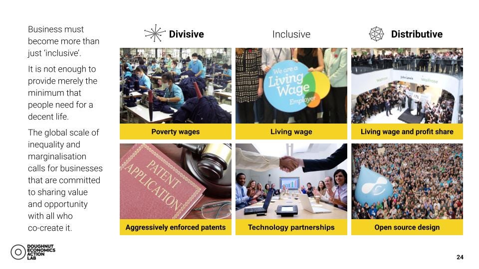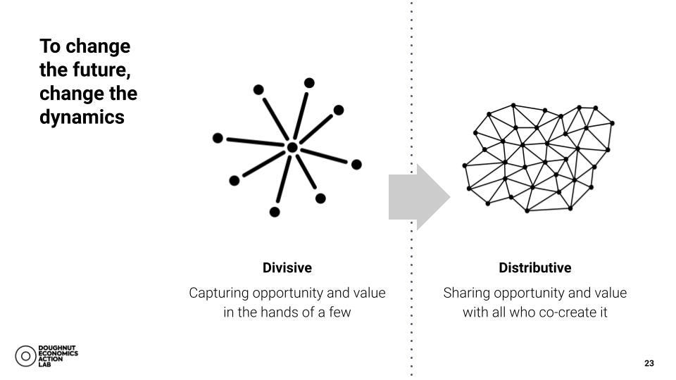 Designing a new economy requires thinking about fair distribution mechanisms for justice, equity, and a fair social system. When looking at the previous three points, we see that the common solution lies in distribution mechanisms. What do we distribute to nature, how are the benefits of growth shared, and what rights do those outside the mainstream human profiles have? How do we distribute which value or concept to whom and how?