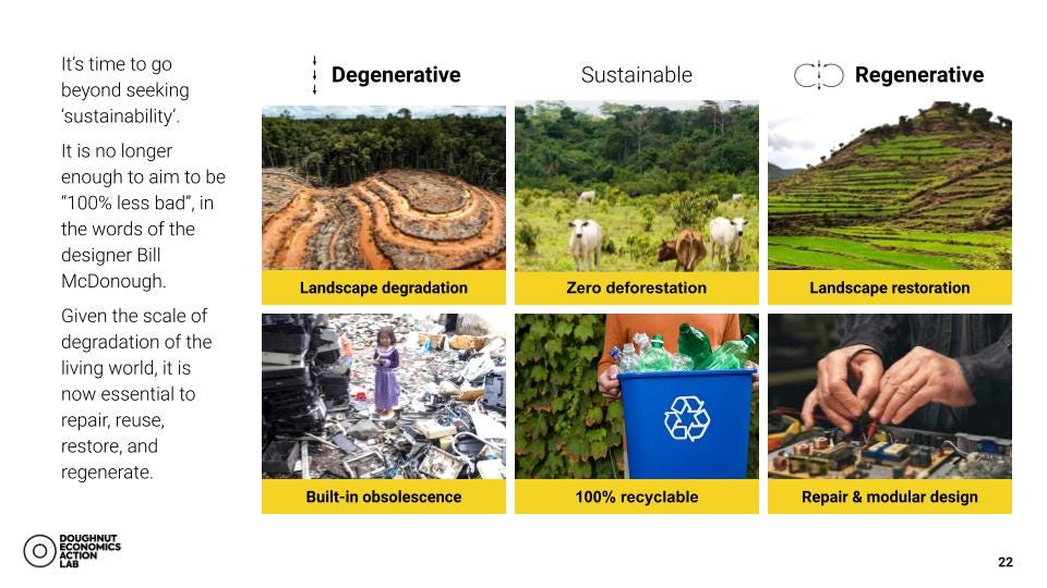 Our new reality is regeneration. We need to replace lost forests (instead of just reducing deforestation) and repair the land and living ecosystems. While continuing to reduce harm, we should design our business models to regenerate the damage we have caused. Otherwise, there will be no world left to live in.
