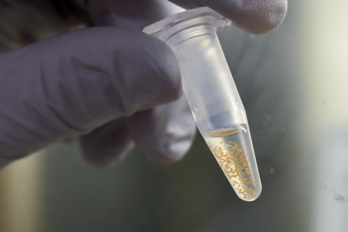 A Michigan State University researcher holds a vial of Arabidopsis seeds floating in water. Each seed can be as small as a grain of sand.