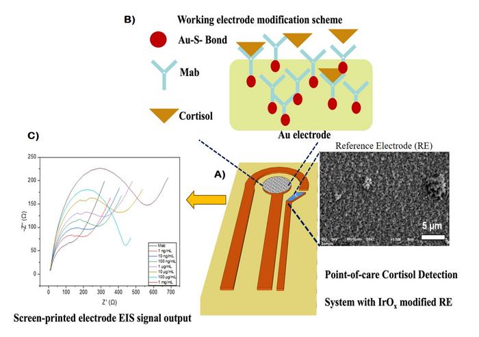 "Current cortisol detectors have reference electrodes with a silver layer that is easily oxidised and unstable in electrochemical measurements," says Ji. "In this study, we used iridium oxide nanoparticles to cover the silver layer. This modification improves the stability, sensitivity and reproducibility of cortisol detection in point-of-care devices."