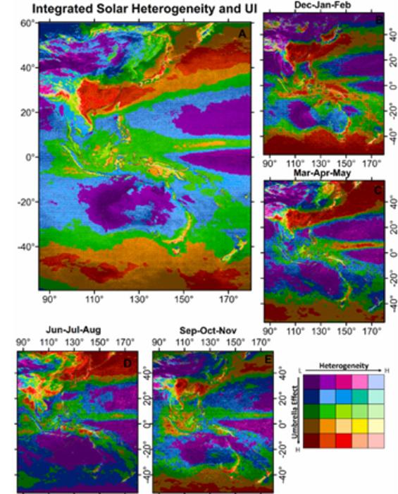 These maps display spatial heterogeneity in solar irradiance and the impact of the umbrella effect on the Asia Pacific region during different times of the year. Using these data, the optimal location of solar power plants can be derived in terms of obtaining a stable and reliable power supply; these regions should have both low heterogeneity and a low umbrella effect index.