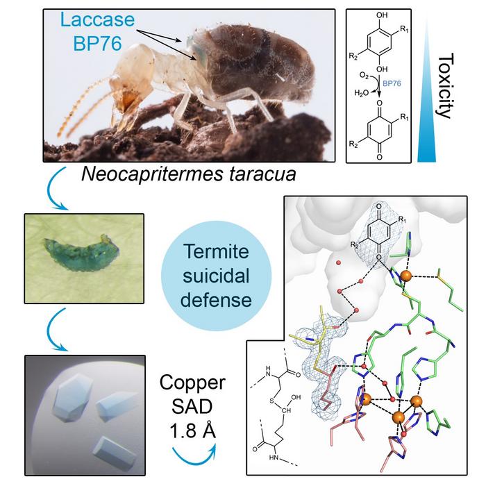 Original article: Škerlová, J.; Brynda, J.; Šobotník, J.; Zákopčaník, M.; Novák, P.; Bourguignon, T.; Sillam-Dussès, D.; Řezáčová, P. Crystal structure of blue laccase BP76, a unique termite suicidal defense weapon. Structure2024. https://doi.org/10.1016/j.str.2024.07.015