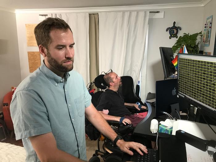 Casey Harrell with his personal assistant Emma Alaimo and UC Davis neuroscientist Sergey Stavisky