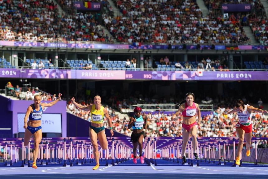Paris 2024 Olympics - Athletics - Women's 100m Hurdles Repechage Round - Stade de France, Saint-Denis, France - August 08, 2024. Lotta Harala of Finland crosses the line to win heat 3 ahead of Liz Clay of Australia, Denisha Cartwright of Bahamas, Yanni Wu of China and Luca Kozak of Hungary