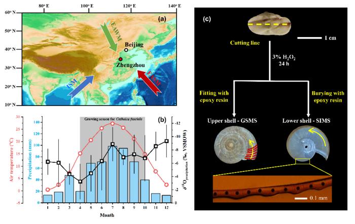(a) Map showing Eastern Asia's prevailing monsoon climates and the sampling site location. The topographic map comes from https://www.gebco.net/data_and_products/gridded_bathymetry_data/, and the red-filled circle and the white-filled circle represent the sampling site and Beijing, respectively. Abbreviations: ISM, Indian Summer Monsoon; EASM, East Asia Summer Monsoon; EAWM, East Asia Winter Monsoon. (b) The multi-year average monthly T, P, and δ18Oprecipitation in Zhengzhou (IAEA, http://www.iaea.org/water). The grey bar represents the growing seasons for Cathaica fasciola at Zhengzhou. The monthly mean T > 10oC from April to October. (c) Land snail Cathaica fasciola and the schematic flow chart for the cutting and sampling of snail shells. The red lines represent the sampling path of the subsamples for GSMS determination; The yellow arrows represent the direction of sampling, which is opposite to the growth direction. The enlarged section shows the sampling spots of SIMS analysis.