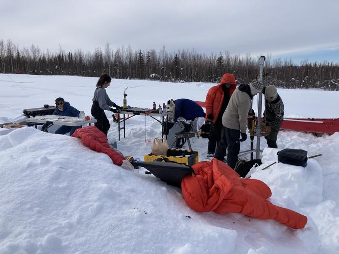 The study’s research team samples soil cores at a site near Fairbanks, Alaska, in winter.