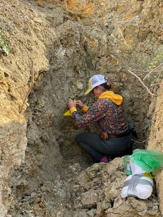 During an NSF-funded trip to the M7.6 earthquake rupture site near Içmeler, Turkey in 2023, Utah State University geoscientist Alexis Ault measures the orientation of the rupture interface and prepares to take samples. Ault is lead principal investigator on a $2.3M NSF-funded multi-institution collaborative project to study earthquake critical zones in the U.S. and abroad.