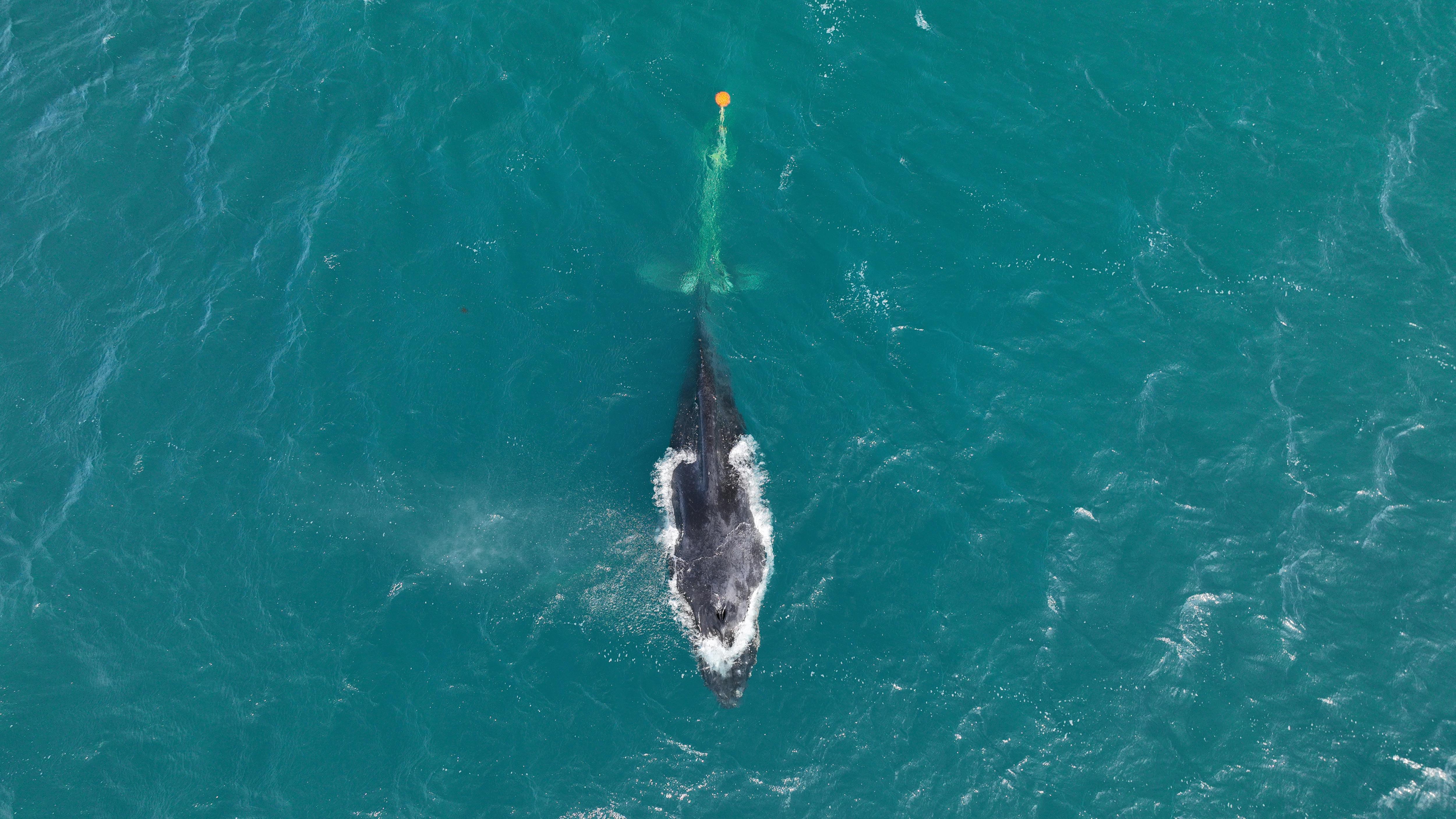 The whale had rope and float tied around its tail.