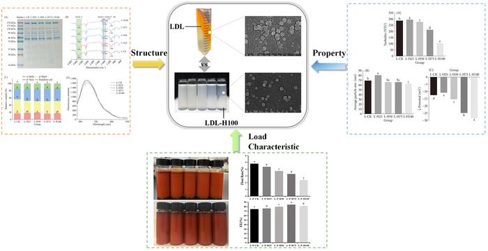 This figure illustrates the effects of high-pressure homogenization (HPH) on egg yolk low-density lipoprotein (LDL) used for stabilizing paprika oleoresin (PO). The structural analysis (left) shows protein integrity and secondary structure changes of LDL under different HPH pressures. The central images compare the morphology and appearance of untreated LDL and HPH-treated LDL (LDL-H100). The right section presents property evaluations, including turbidity, particle size, and ΞΆ-potential, demonstrating improved stability with increasing HPH pressure. The bottom section displays load characteristics, highlighting the reduced floating rate and enhanced encapsulation efficiency (EE) of PO with HPH-treated LDL, underscoring the technique's potential to improve PO stability and application in aqueous environments.