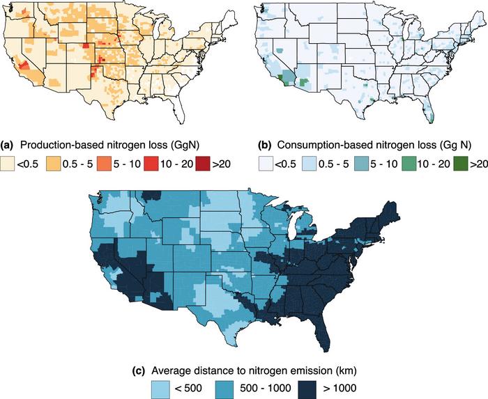County-level nitrogen losses from (a) production-based accounting and (b) consumption-based accounting. The weighted average distance between consumption and nitrogen losses during production is depicted in map (c).