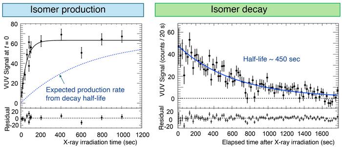 (Left) The VUV signal immediately after X-ray beam irradiation on 229Th doped CaF2 crystal vs. irradiation time. The VUV signal according to irradiation time reaches its saturation value faster than the expected decay half-life by a factor of about 10. (Right) The observed temporal profile of the isomeric decay signal with a half-life of ~ 450 seconds. This suggests that the isomeric state decays faster during X-ray irradiation, indicating quenching.