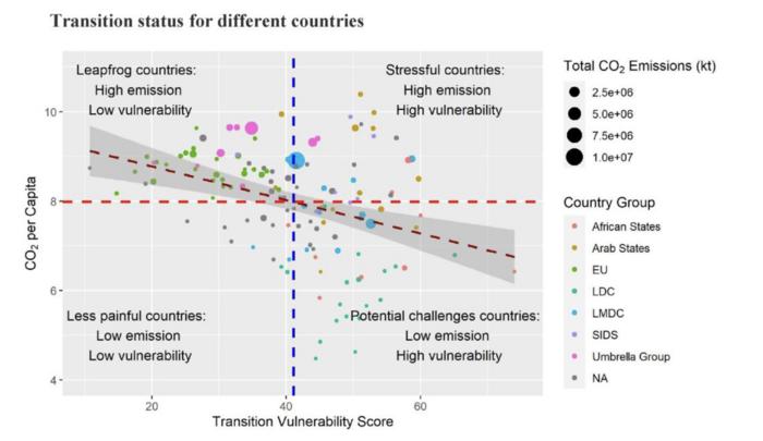 The relationship between transition vulnerability and CO2 emission per capita at the national level. We report the results in 2019 to reflect the current status of each country.