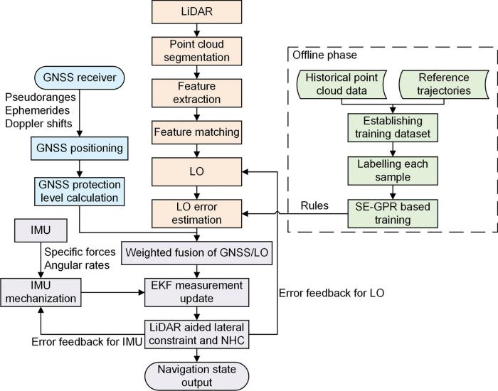 Framework of the proposed GNSS/IMU/LO integrated navigation algorithm. In this framework, the GNSS/LO weighted position based on the error modeling is loosely integrated with IMU in the EKF. The motion constraints including LALC and NHC are implemented to further suppress positioning error accumulating.