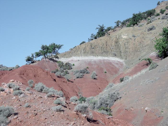 Deposits in Morocco associated with the Triassic-Jurassic mass extinction, 201.6 million years ago. Red sediments in many locations around the world contain Triassic-era fossils. The white band on top of them is where the sediments were altered by massive volcanism, as evidenced by the gray/black basalt layers topping the assemblage.