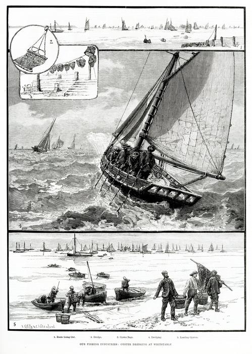 Whitstable, Kent 1) Boats Going Out 2) Dredge 3) Oyster Bags 4) Dredging 5) Landing Oysters. From the Illustrated London News