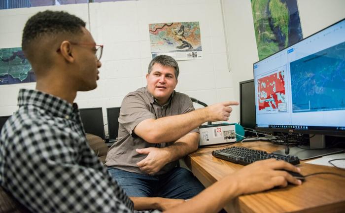 Joshua Slaughter (left) and Matthew Fagan discuss a map of forest patches in Costa Rica. A global map of potential natural forest regrowth areas developed in a new Nature study led by Brooke Williams and Hawthorne Beyer and based on a global forest patch database developed by Fagan suggests that an area larger than the size of Mexico in the tropics has the potential to regrow and store 23.4 gigatons of carbon. (Marlayna Demond/UMBC)