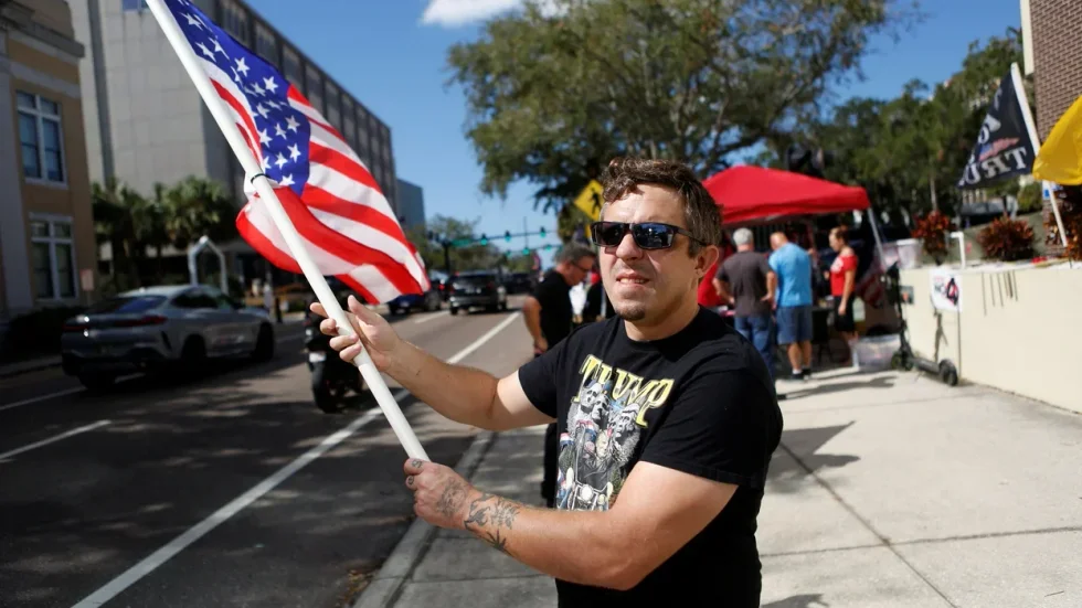 A supporter of Republican presidential nominee Donald Trump rallies outside an early polling precinct as voters cast their ballots in local, state, and national elections, in Clearwater, Florida, U.S., November 3, 2024. REUTERS/Octavio Jones